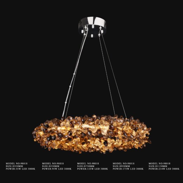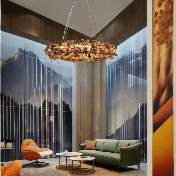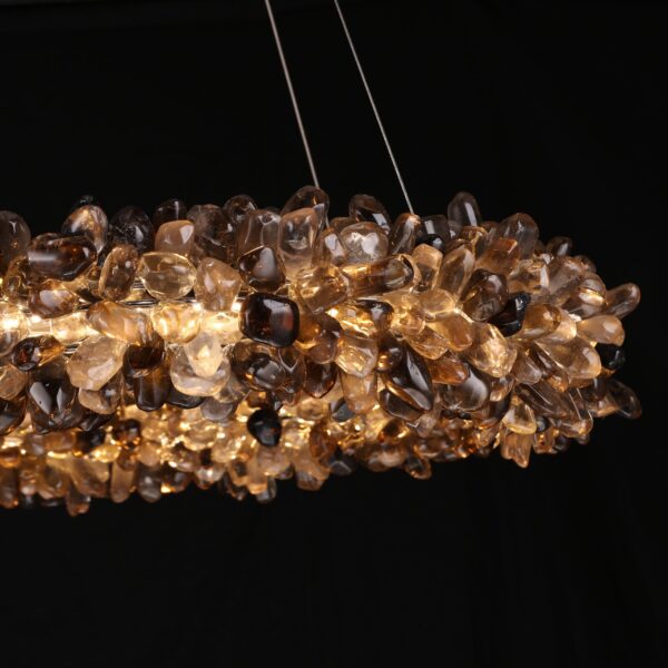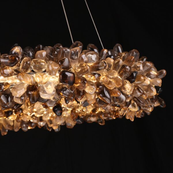 Immerse your space in the warm, earthy glow of our Smoky Quartz and Citrine Crystal Chandelier. This exquisite hanging chandelier, with its elegant spherical design, is lavishly adorned with an array of polished citrines and smoky quartz. The harmonious blend of these crystals infuses any room with a cozy, inviting ambiance. Available in various diameters, this chandelier is perfect for enhancing the aesthetic of both rustic and industrial decors.